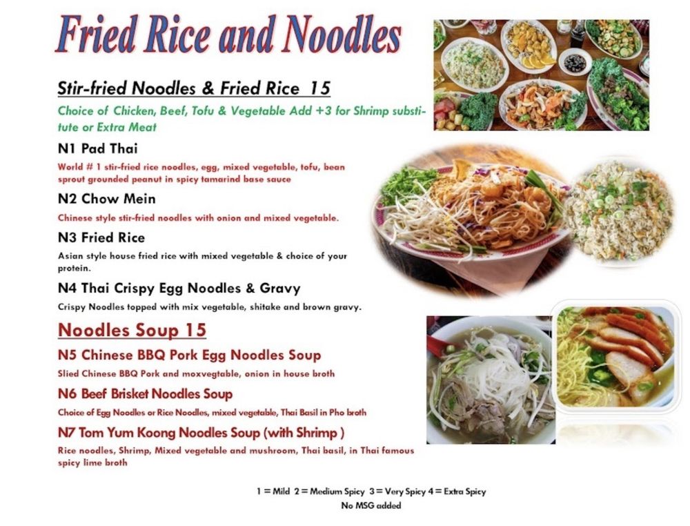 World famous stir-fried rice noodles with touch of Thai spicy and tamarind base sauce eggs, mixed vegetable, bean sprout and ground peanut.